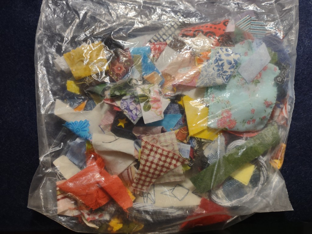 - Fabric pieces. These can literally come from anywhere. Fabric remnants, leftover project scraps, old clothes, thrift stores, Facebook marketplace, friends, family or even neighbors who craft and have scraps they’re getting ready to throw out or are willing to donate. You can also purchase bags of scraps from places like Etsy and eBay.