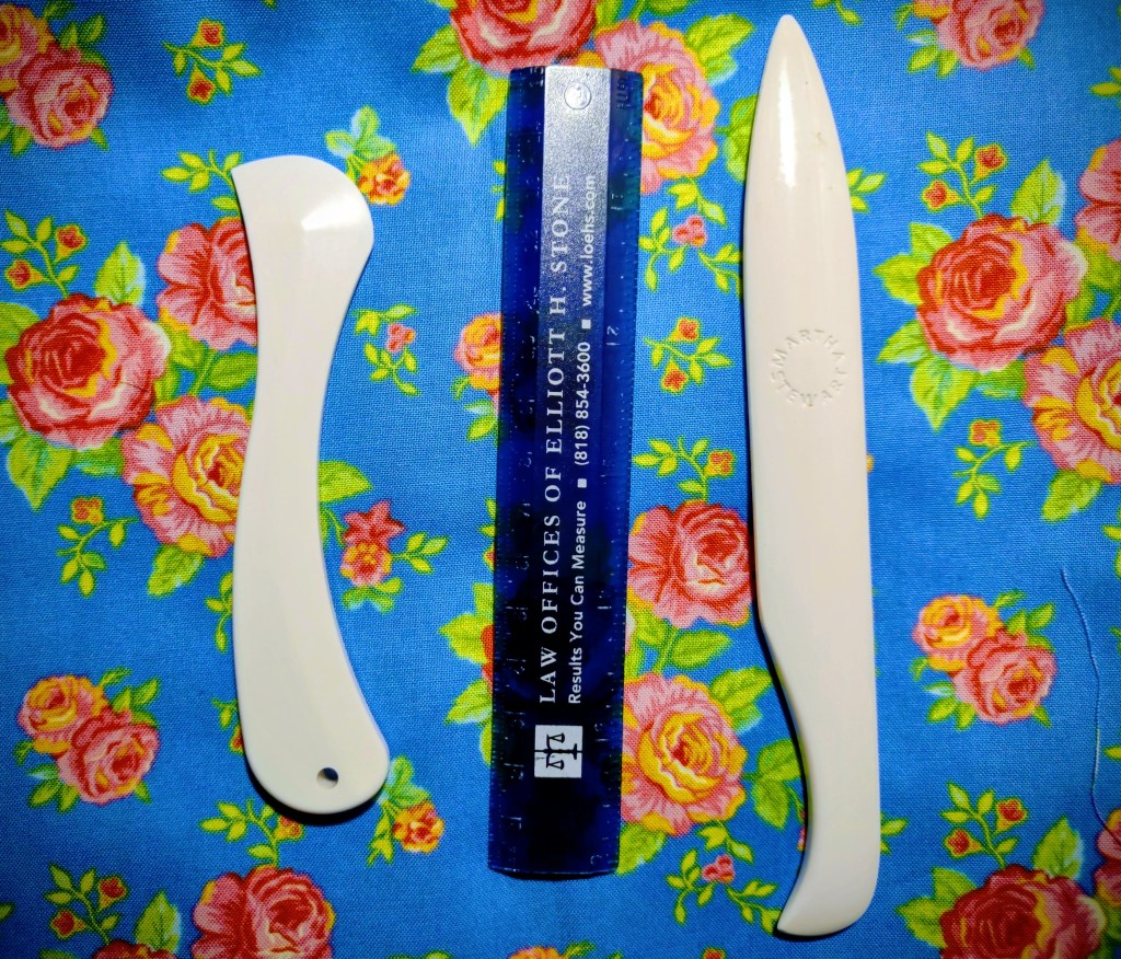 - Something with an edge like a small ruler, hera tool, bone or wood folder. Anything that can make a crease if you want to fold an edge over. In a pinch, your thumbnail will do the same thing. Not too big if you want it to be portable.