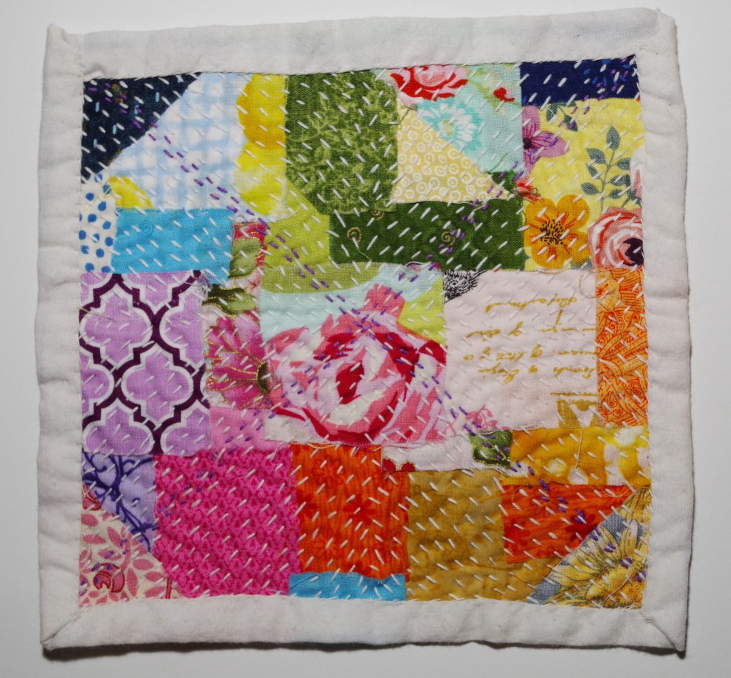 But, as you begin to lay down stitches, something wonderful starts to happen: those pieces of fabric begin to transform into a gorgeous motley montage of color and pattern in a way you probably could not have imagined! Sometimes, they show their beauty before stitches are even added. To this day, I am still shocked and delighted when a bunch of random abric pieces create a medley of unexpected beauty.